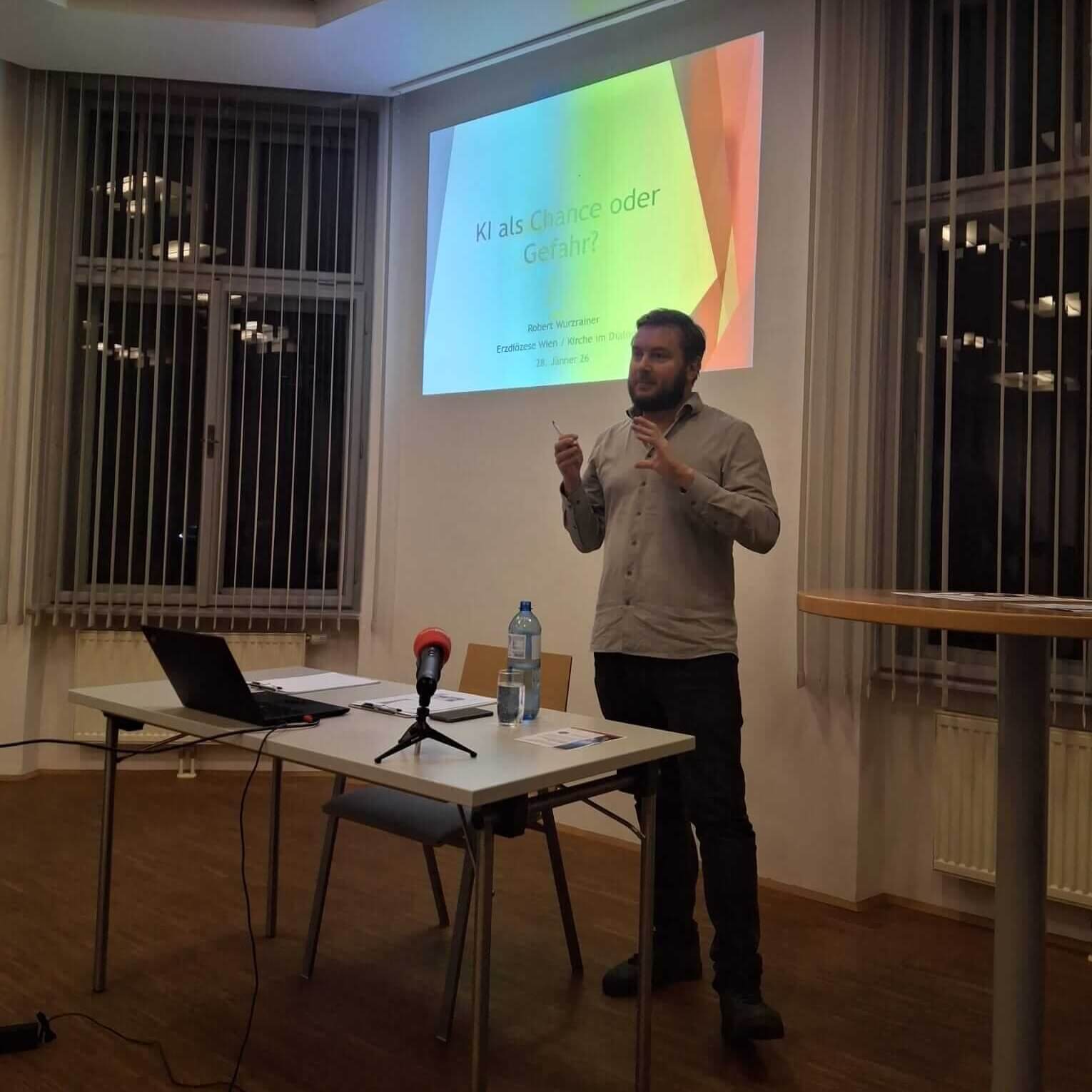 Als Referent konnte Mag. Dr. Robert Wurzrainer, Religionswissenschaftler und Ethikexperte an der Universität Wien, gewonnen werden. In seinem rund zweistündigen Vortrag spannte er einen weiten Bogen – von den historischen Anfängen der KI-Forschung bis hin zu aktuellen Anwendungen im Alltag.