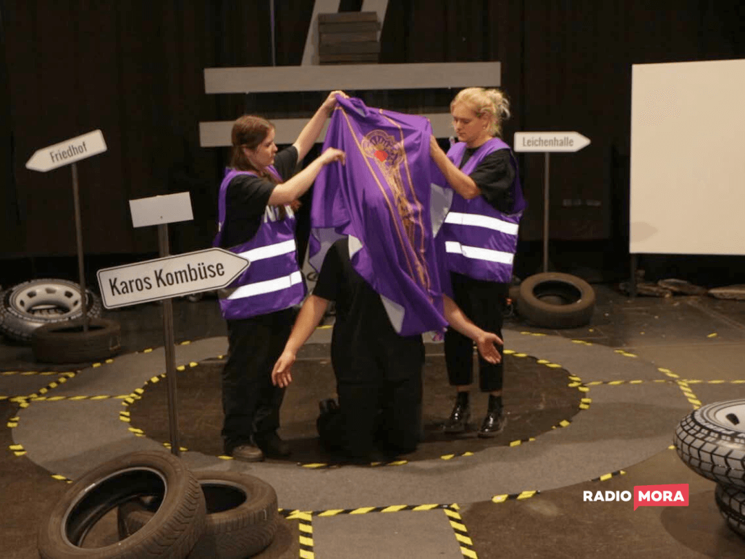 Für die Regie zeichneten Valentina Himmelbauer und Teresa Schmid verantwortlich. Sie teilten das Geschehen konsequent in Diesseits und Jenseits und machten diese Ebenen auch visuell erfahrbar. Das Bühnenbild von Edith Peyer, erstmals als Installation konzipiert, arbeitet mit starken Symbolen: Kreisverkehr, Kreuz, Hashtag und Venuszeichen verschmelzen zu einer vieldeutigen Bildsprache. Leichte Schwimmreifen ersetzen schwere Autoreifen und verleihen der Inszenierung eine spielerische, fast kindliche Note – ein bewusster Kontrast zur politischen Schwere des Themas.