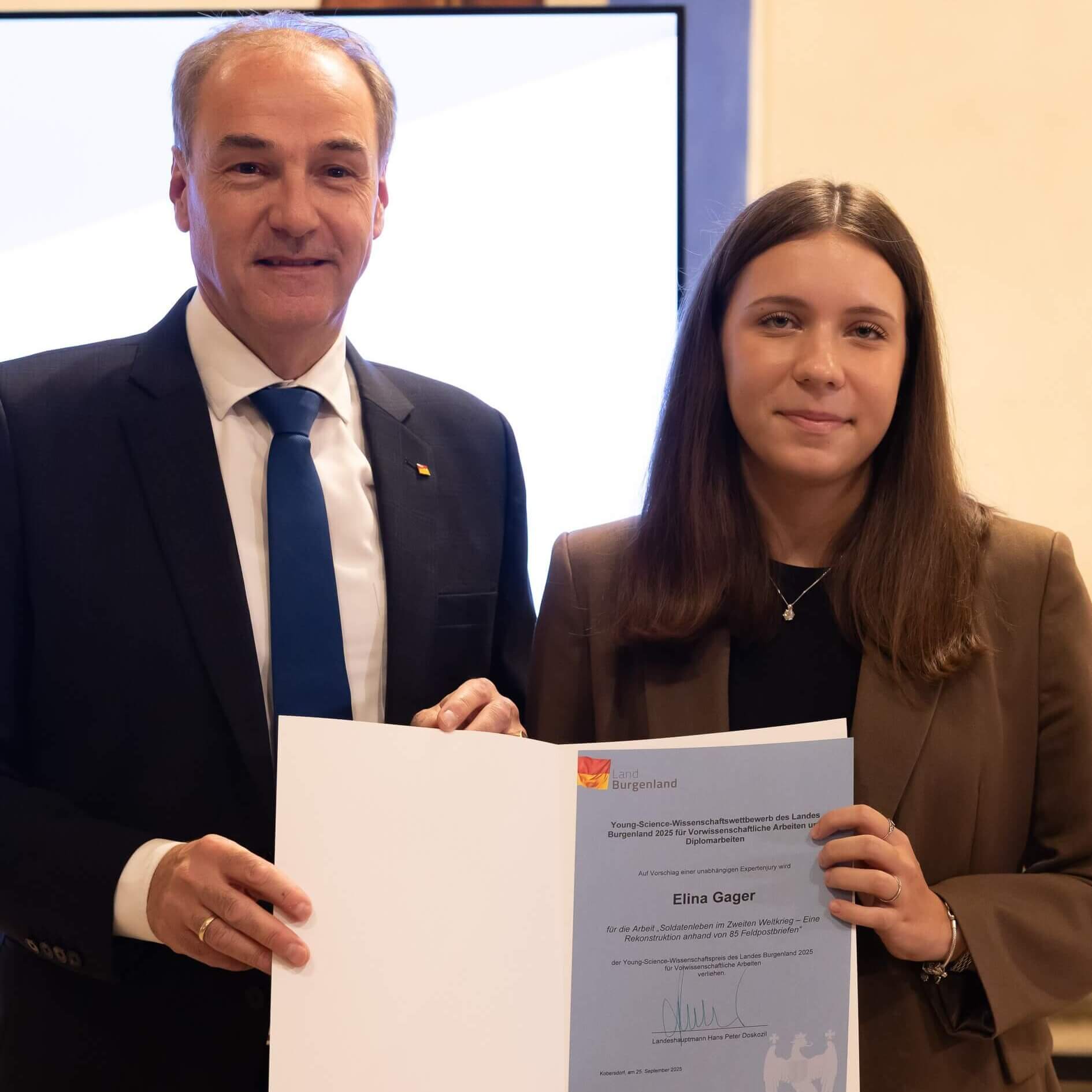 Im Mittelpunkt des diesjährigen Festakts stand der Young Science Wissenschaftspreis 2025. Er ging an Elina Gager vom Gymnasium Oberpullendorf und Hannah Artner vom Wimmer-Gymnasium Oberschützen. Beide Arbeiten befassten sich mit der Geschichte und Entwicklung des Burgenlandes – aus persönlicher und analytischer Perspektive.